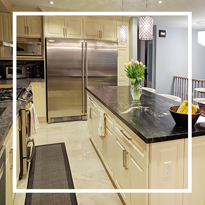 We managed to help the client cut down clutter by making sure there’s adequate storage room in the remodeled space. We gave the cabinets sleek hardware and simple mouldings to completely change their look. The cream color of the cabinets blended perfectly with the darker colored backsplash and countertop.